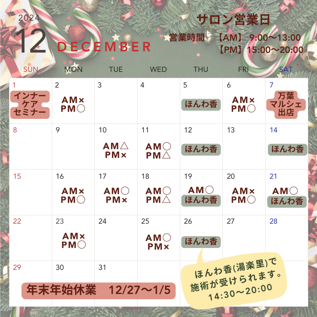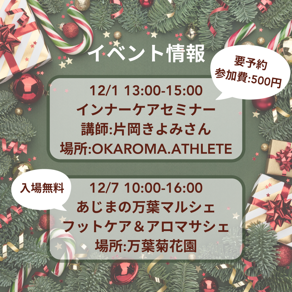 12月は1日に愛知から講師をお呼びしてインナーケアセミナーを開催いたします。日頃からアロマケアを受けている皆様によりアロマやサプリメントを通してインナーケアを行うことの大切さを知っていただける機会となっています。楽しみにしていてくださいね!