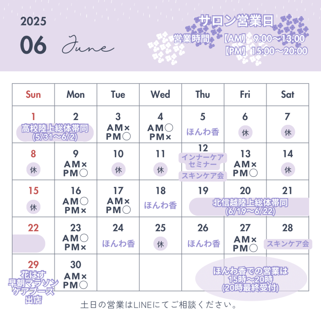 6月のサロン営業日と、皆様の心と身体の美と健康をサポートする様々なイベントについてお知らせいたします。この機会に、ぜひご参加ください。