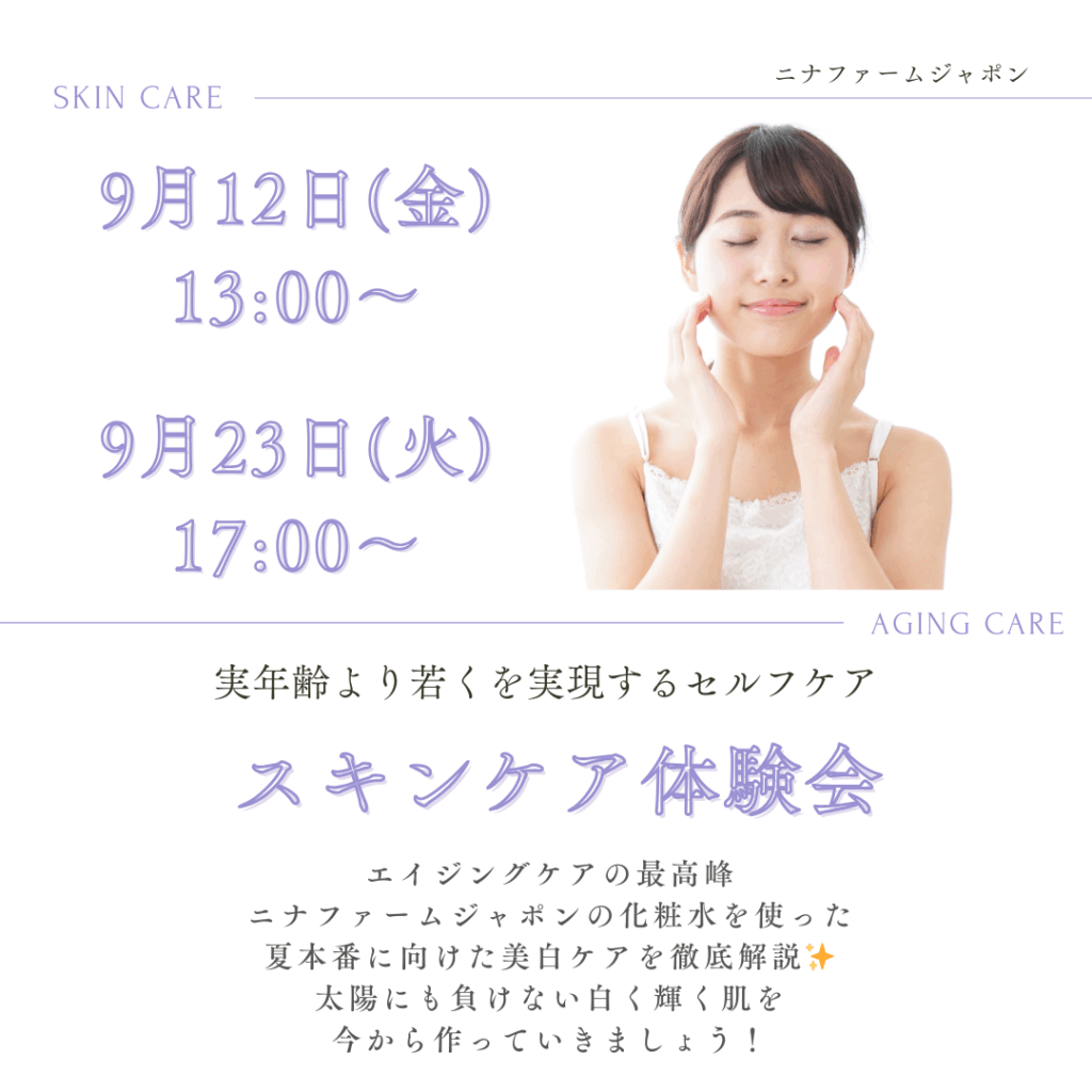また、今月はスキンケア体験会を2回開催予定です。お日にち、お時間は以下の通りです。
