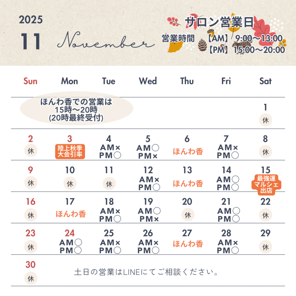 11月は平日の営業日も少し多めになっていますので皆さんの都合に合わせてご予約をしていただけたらと思います。
